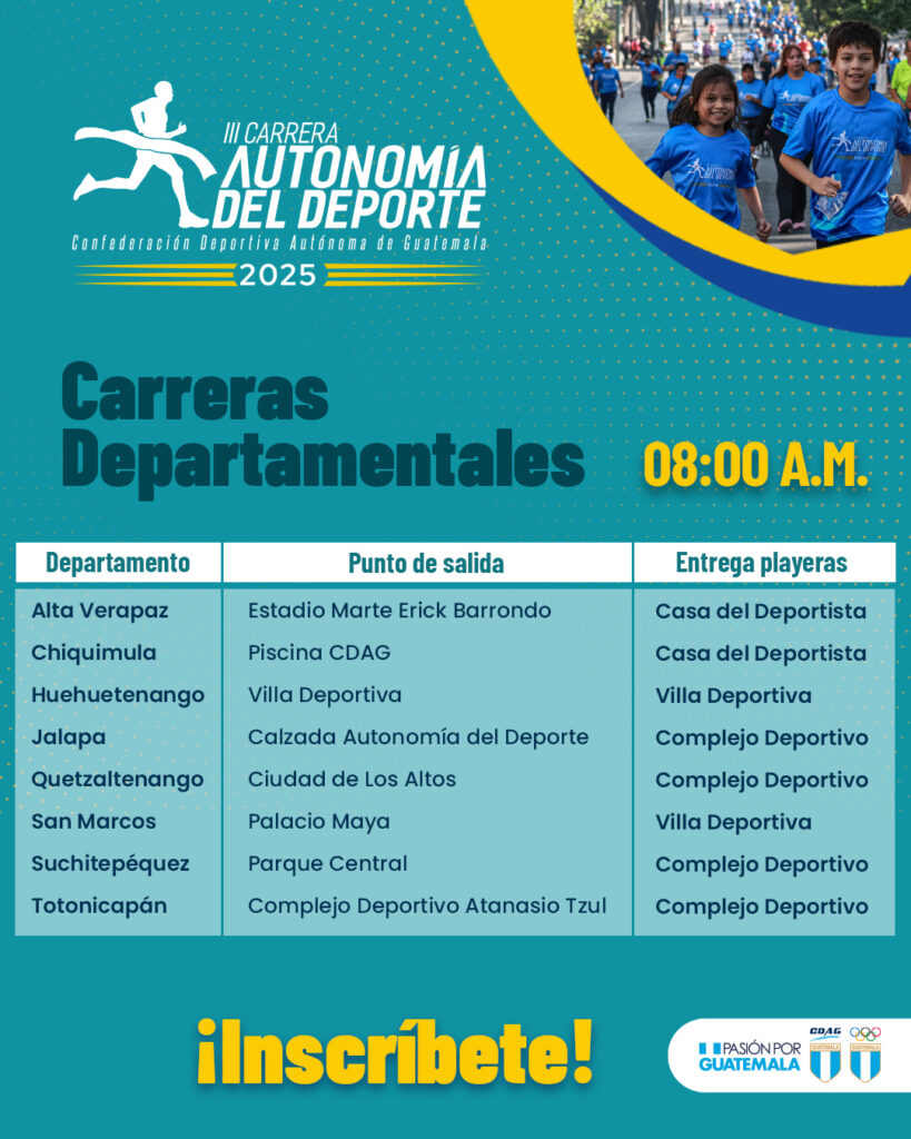 La entrega de playeras a todos los inscritos en la III Carrera Autonomía del Deporte (𝗖𝗶𝘂𝗱𝗮𝗱 𝗱𝗲 𝗚𝘂𝗮𝘁𝗲𝗺𝗮𝗹𝗮) se realizará el viernes 16, de 10 a 18 horas, y sábado 17 de mayo, de 8 a 16 horas, en el Museo del Deporte de Guatemala (Distrito de Cuatro Grados Norte, en la zona 4 de la ciudad capital).